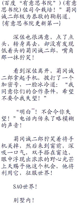 更可怕的是,当SAO通关之后,根据茅场晶彦留下的信息,这些玩家就可以离开游戏世界,回归现实,到时候,他们都是‘超人’。更方便hei.