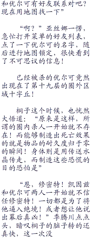 “”桐子和亚丝娜一脸无语,你倒是说点有用的呀。
