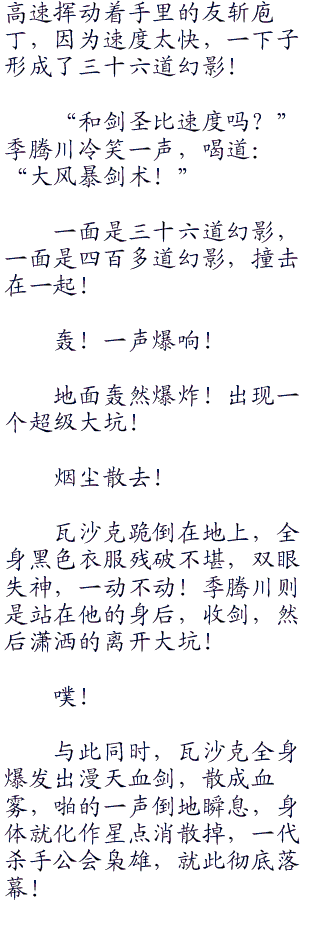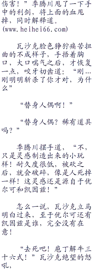 “切!”瓦沙克不屑的一笑,不过下一刻,突然感觉一股毛骨悚然的寒意出现在身后,想要躲闪,已经迟了!