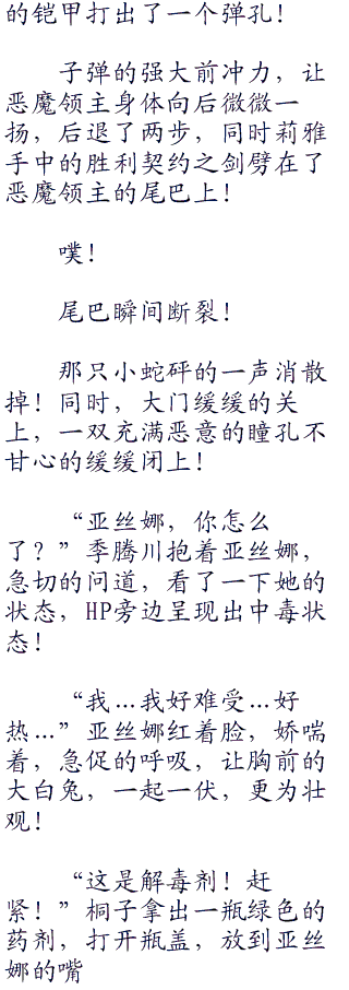 “大意了!”季腾川也认为到了大门口,应该已经安全,恶魔领主最多只能干瞪眼,没想到那条蛇头尾巴不仅能够伸长,还能够冲出房间外,袭击了亚丝娜!