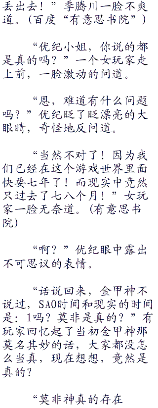 “这里…真的是SAO吗?那个茅场晶彦开发出来的游戏?”优纪抱着侥幸心理问道。
