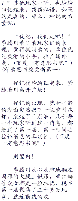 “”那些玩家们闻言,个个目瞪口呆,我说,丫头,装傻也该有个限度才对吧!正当我们是白痴啊!