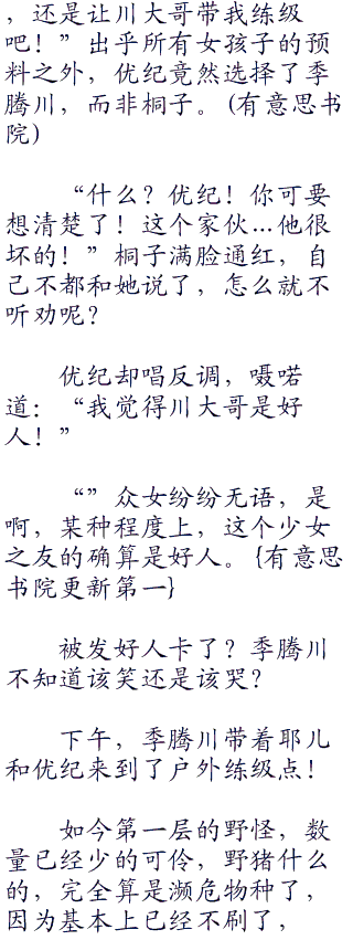 “优纪,我带你去练级好不好?”季腾川一脸微笑的提议道。