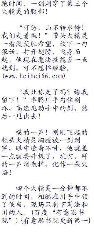 “怎么会…完全看不清”火精灵不甘心的大叫一声,步了第一位后尘,身体消散掉,留下了一朵火焰漂浮!