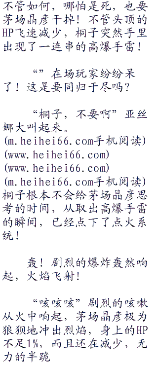 “明智的选择!”茅场晶彦面露微笑,同时操作界面,弹出一个窗口,随后解除了不死的属性,同时将桐子和他的HP调到等量!