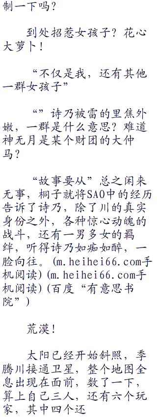 诗乃算是老玩家,对于地图的掌控,是川和桐子这个刚入门的没法比的。虽然季腾川知道,荒漠有一处洞窟,但是具体在哪里,他并不知道。