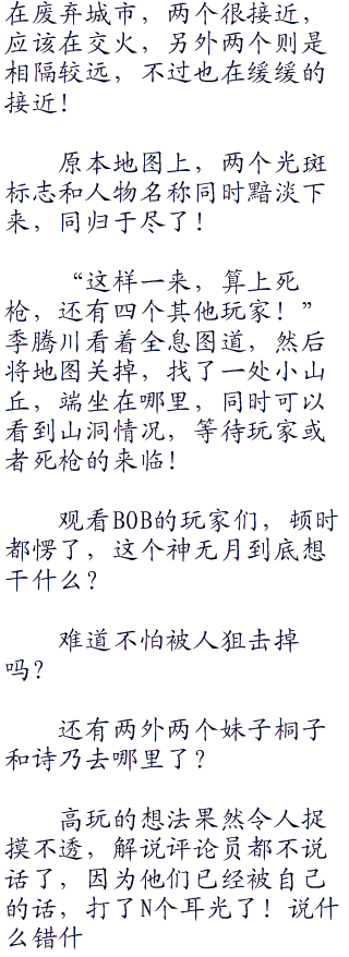 当然,季腾川并不知道,自己的无心举动,让以后BOB大赛,临时组队成为了必然,不过‘同伴’之间下黑手,照样不少!
