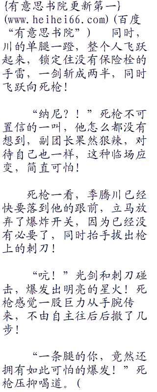 “到底是哪一个呢?副团长!”死枪哈哈哈狂笑,黑夜之中,辨认出那个是被拉掉保险栓的手雷,简直难度登天,还要将其射落,在引爆前的一秒!死枪极为阴险的左手放在后背,一个引爆按钮!