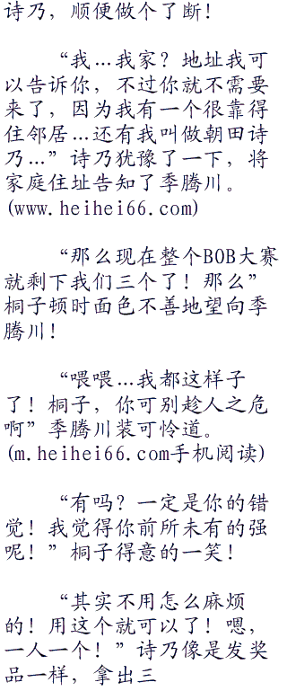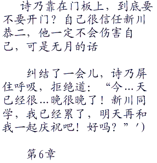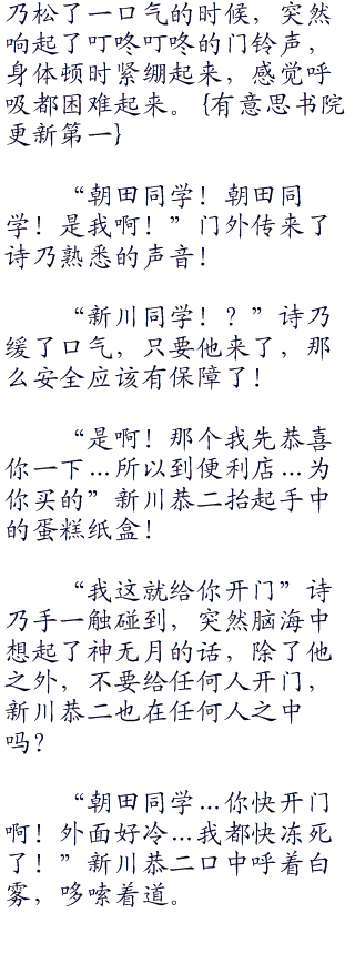 “诗乃,在家里呆着,我去找你!顺便报警,记住,不要给除我之外的任何人开门!”季腾川不允许新川恭二这个连游戏和现实都分不清的脑残碰到