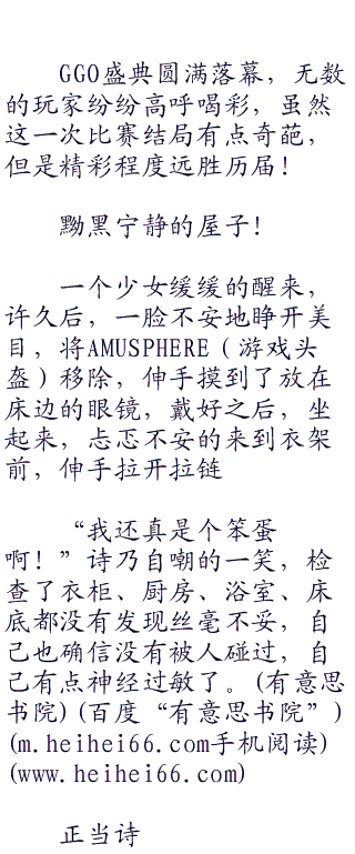 手枪子弹射出,飞向惶恐的诗乃,瞳孔渐渐放大,只要被击中,死枪在现实中的同伙就会对她下杀手,冰冷的触手,药物注射进入自己的体内!