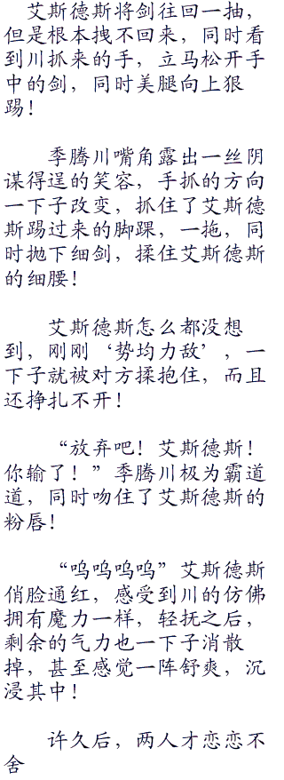 艾斯德斯反手一剑,季腾川同时伸出手,迅雷不及掩耳之势捏住刺来的细剑,同时另一只手,抓向艾斯德斯的大胸。