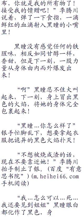 “你就是赤瞳的妹妹,黑瞳吗?”季腾川走到黑瞳面前,一个非常可爱的少女,眼角带着泪珠,刚刚应该在哭泣!