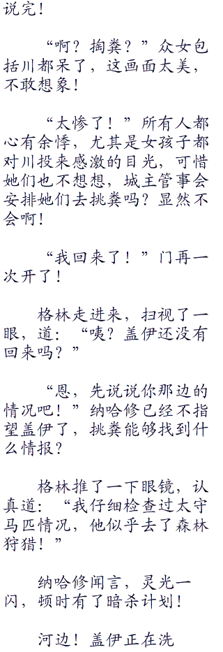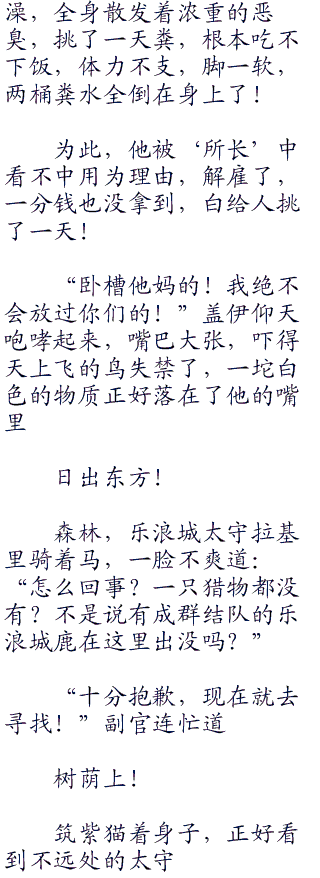 “喂喂喂…挑粪的,不要发呆,一共有六个厕所,都等着你挑呢!”‘所长’指着盖伊叫道。