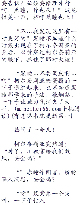 “据说对肩膀酸痛很有效哟!筑紫!”波尼不怀好意地望向筑紫的那对大波,明明年纪比她小,但是却这么大,而且捏起来好软!