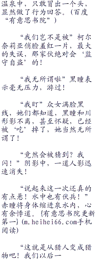 “没想到这里都能够找到温泉,疲劳一扫而空!”柯尔奈莉亚满足的一笑,用浴巾将奥妙的身体包裹起来。