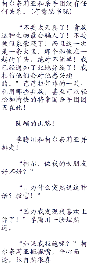 “瞎说!那是因为害羞”季腾川话音一转,笑眯眯望着柯尔奈莉亚道:“时间还早,要不要一起去泡澡呀?”