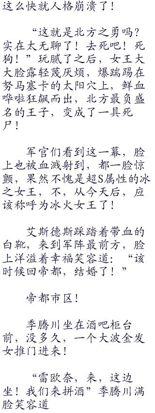 三兽士和士兵们都一脸默哀地望向地上的王子,落到艾斯德斯,超S女王手里,还不如自杀了比较痛快!