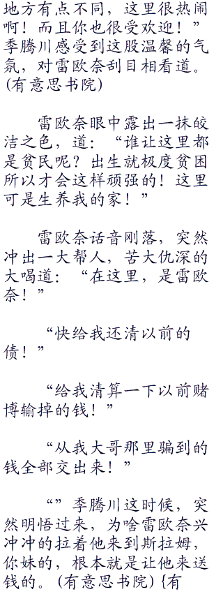 “走吧!我带你去我出生的地方!”雷欧奈起身,柔嫩牵住川的手,两人步行走向帝都的贫民区之一斯拉姆!