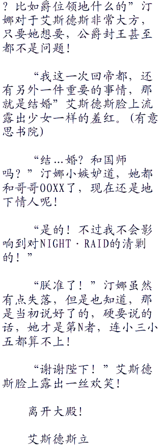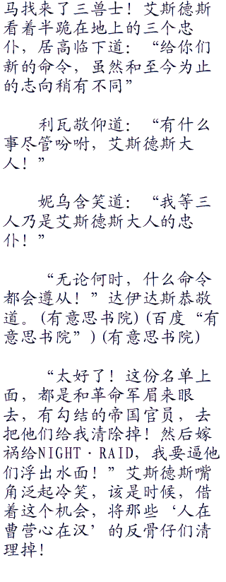 “艾斯德斯,很抱歉,虽然你刚回来,但是有一件极其重要的事情,要交给你做!帝国周边有名为NIGHT·RAID杀手团,在帝都为非作歹,希望能够借助将军的武力,将其扫灭!”大臣咧嘴一笑,吃着肉道。