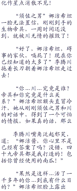 “有意思!竟然敢反抗我!道具反抗主人,那么只有一个下场…那就是被毁灭!”季腾川脸上露出冷笑,手一挥,千变化作一柄两米长的太刀,他已经决定将须佐之男毁掉了!