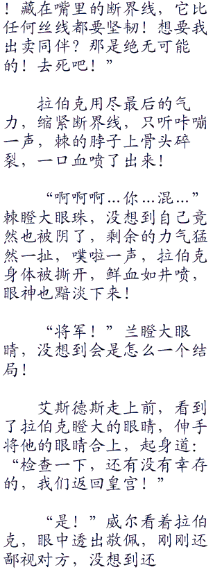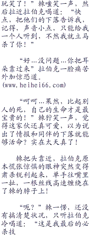 “不要杀…我…我告诉你其…他同伴的下落”拉伯克脸色煞白,痛得快要昏厥过去了!