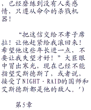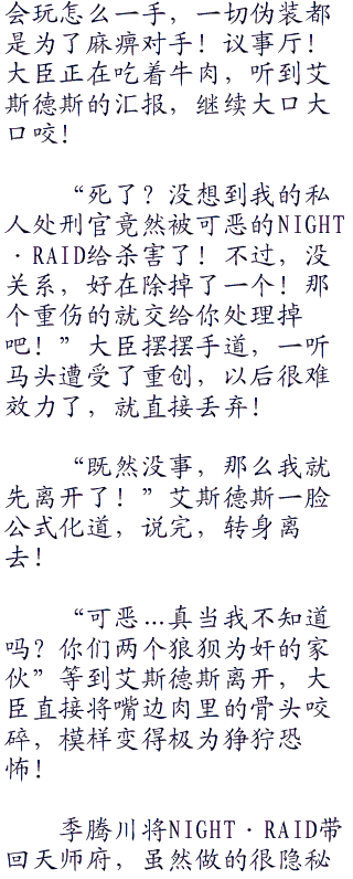 “哦?要选择出卖同伴苟且偷生吗?不过貌似抓捕你们NIGHT·RAID可是艾斯德斯大将军的事情!”棘露出思索,似乎对NIGHT·RAID的情报不是很感兴趣!