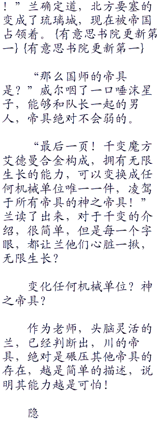 “这个是…帝具百科介绍?”兰眼睛一亮,立马拿了起来,翻阅开来,果然上面有着四十九件帝具的详细介绍!