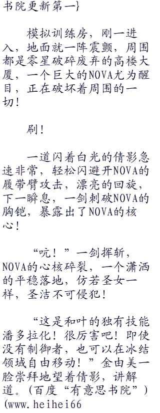 季腾川找了一个不起眼的位子坐下,打开电脑,开始浏览网页,而台上的女教师则是开始讲述NOVA的入侵历史,季腾川自然觉得格外的无聊,他对这些完全不感兴趣!