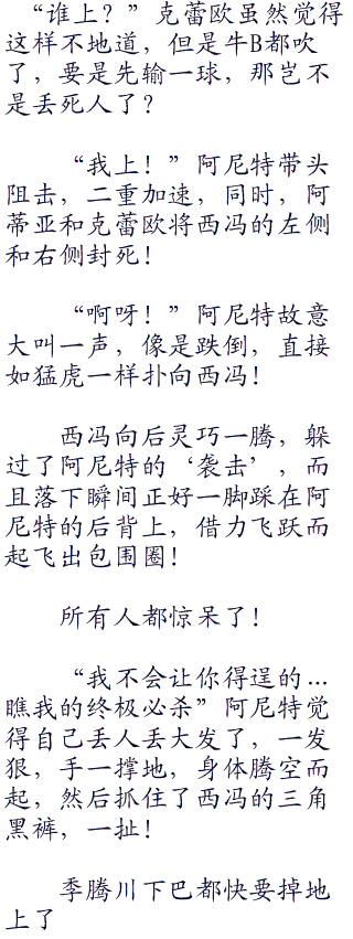 “纳尼?”伊丽莎白正洋洋得意,没想到,脚下的球突然消失掉了,回头一望,西冯将球给劫走了!