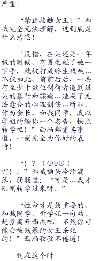 “果然是禁止接触女王,没碰到都挨一刀,碰到了还不是要被千刀万剐?”缇茜暗暗吐槽,同情地望向这个新来的转校生,貌似上一次莎缇莱弄残的也是转校生,难道她和转校生有仇吗?