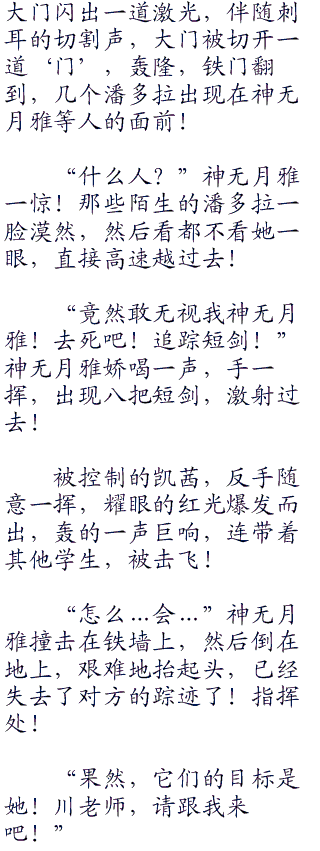“与敌对潘多拉交战!艾琳、姚蜜、凯瑟琳…负伤,丧失战斗能力!”那些去阻止敌潘多拉的四年级,以不可思议的速度倒下,好在没有受到什么致命伤!