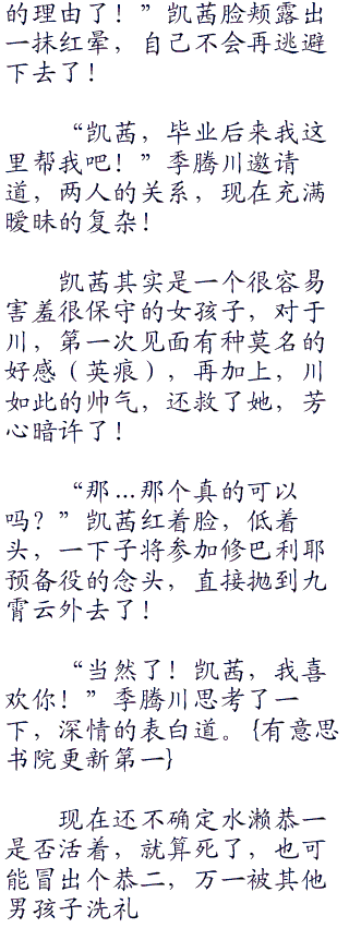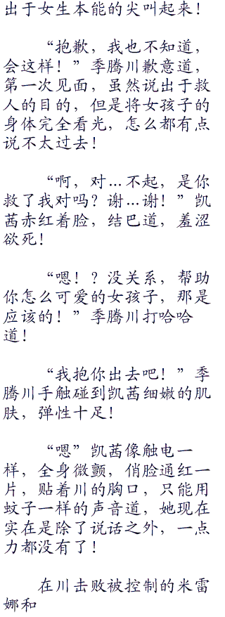 “我这是…在什么地方?”凯茜渐渐恢复神智,苏醒过来,感觉到温暖的怀抱,好舒服!“这里是西杰尼提克斯!”季腾川尴尬道,连忙将自己的外套脱下,盖在凯茜的身上。