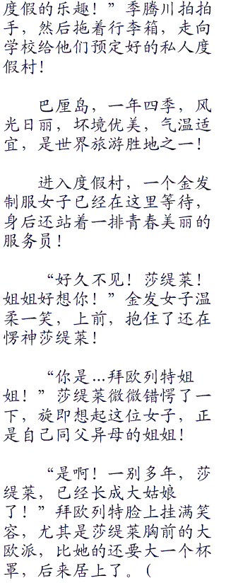 “听说了吗?为了奖励这一次三年级和二年级的突出表现!学校不仅放假七天!还提供巴厘岛七日游!”阿蒂亚一脸兴奋道,将自己打听到的消息公布出来!