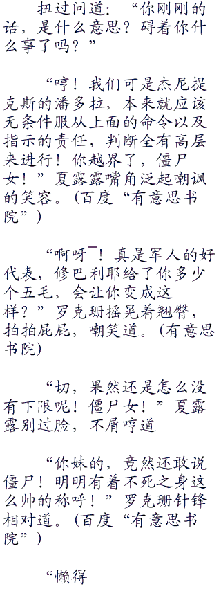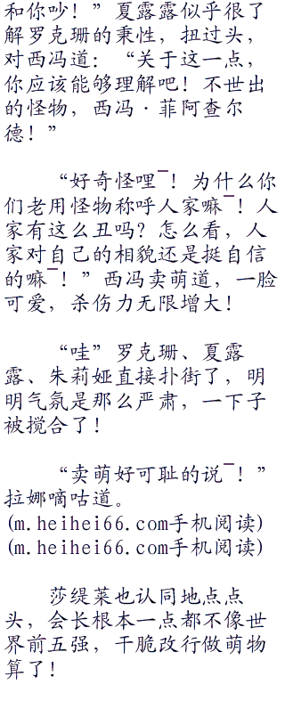 “呵呵~~!那个莎缇莱…请不要介意,罗克珊她是个白痴加笨蛋!她没有恶意的”西冯牵强的笑呵呵解释道,非常过意不去,应该事先说明罗克珊这女色狼的本性才对,真是她的疏忽大意啊!