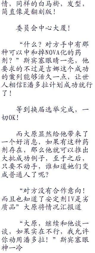 “那好吧!首先现在吉娜没事,刚刚注射了中和剂!体内的NOVA化侵蚀被排除掉了!当然,现在的她,也没有E潘多拉那种力量了!”季腾川先说明吉娜目前的状况。