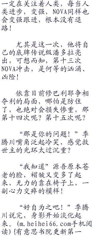 季腾川猜测,有两种可能,第一是最先进化成功的‘神’,不希望出现新的竞争者,于是进行大清洗,第二种,就是希望人类这个种群在毁灭的危险之下,诞生新的‘伙伴’。