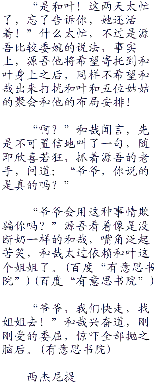 “我”看到源吾苍老的面容,和哉一时间不知道如何反驳好!事实上,和哉知道爷爷是疼爱自己的,但是姐姐的逝世,还有对他的安排,人生的操控,让他对爷爷有了极大的成见,当然,也可以被认为是叛逆期!
