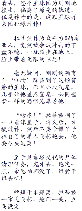 思前想后,拉蒂兹突然眼睛一亮,自己貌似还有一个弟弟,作为赛亚人,就算再不争气,现在两三百战斗力总该有吧!