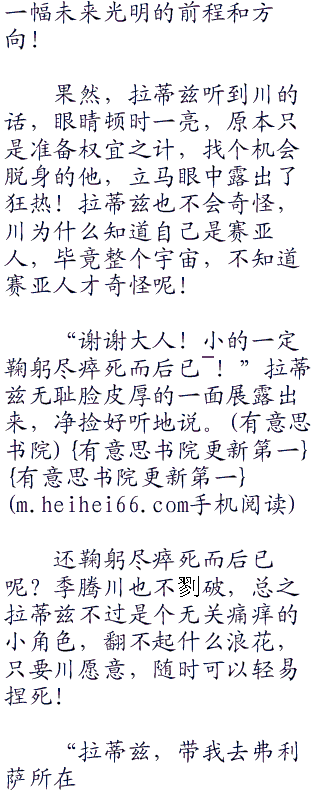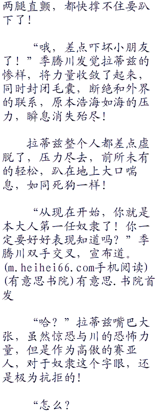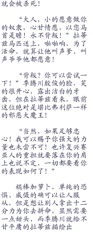 “小的我…我叫做…拉蒂兹!大人!”拉蒂兹都不敢抬头,全身都因为惊吓散发出来的汗水给浸湿了。