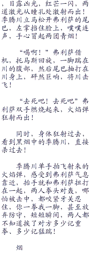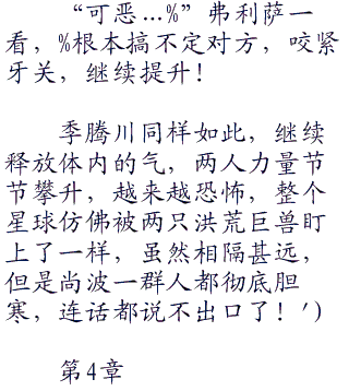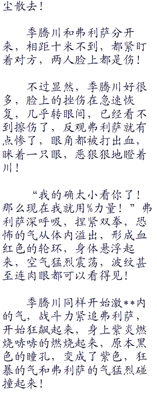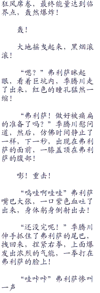 当然,弗利萨根本就没指望,一下子能将季腾川给打死,只是一直被压着打,心里憋着一股怒火,要痛扁回来!
