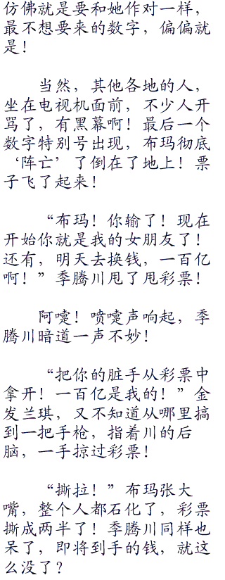 第三个号码!第四个号码相继出来,是!布玛的小嘴一张一合,运气,一定是瞎猫碰死耗子,下一个数字绝对不会是!