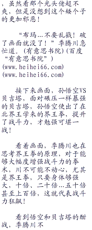 季腾川听到悟饭天真无邪的话,直接笑喷了,比克啊比克,你也有今天啊!其他人乱说什么,比克不会太过在意的,他是独立独行的魔王,但是悟饭这一问,绝对让比克留下很深的心理阴影!