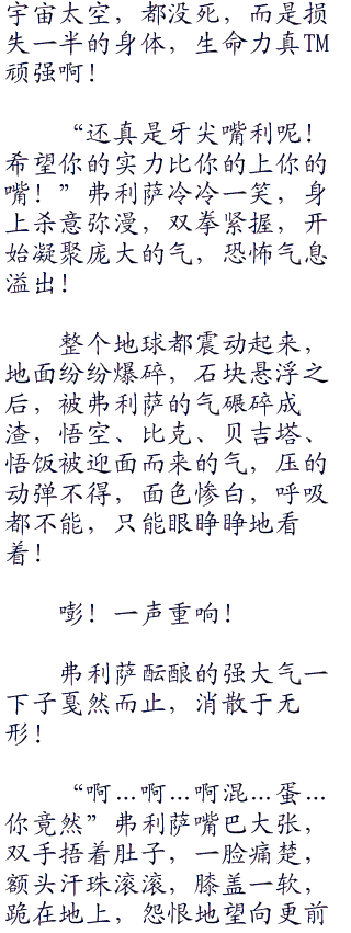 “啪~啪~啪!”弗利萨一直冷漠旁观,拍手冷笑道:“精彩!不过杀掉一些废物,也不能挽回你注定失败的命运!”