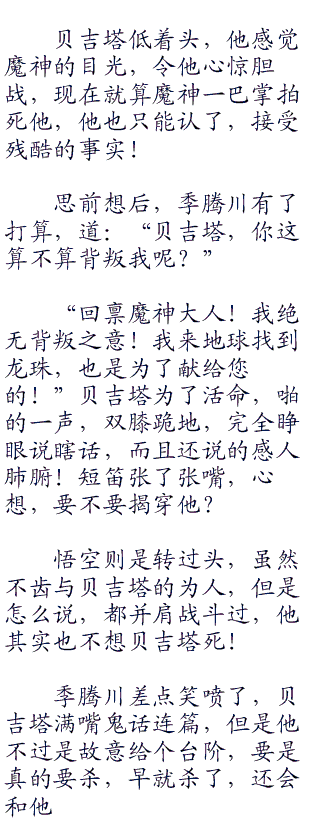 季腾川走向悟空、贝吉塔他们,悟饭已经吓得紧抱着悟空的大腿不放,比克也如临大敌,贝吉塔则是一脸复杂、不甘和无奈!