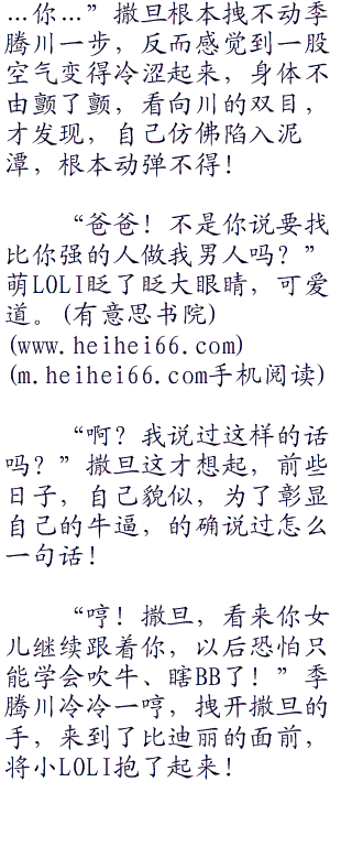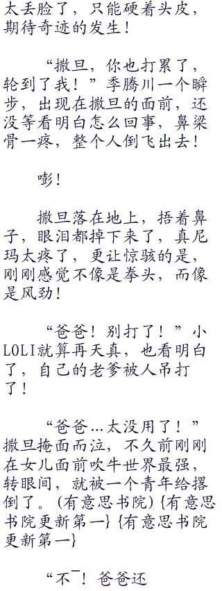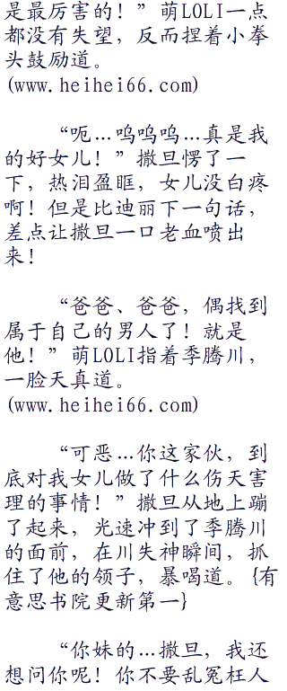 “爸爸,你流了好多血啊!”萌LOLI捂着小嘴,被撒旦这个样子,吓得不轻,还是第一次看到老爸怎么凄惨的模样!