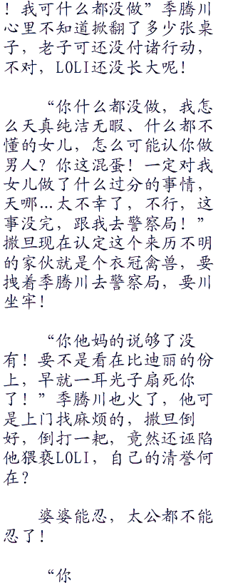 “小子,你好卑鄙啊!不要碰我女儿!”撒旦气得不行,这混蛋,竟然敢占他宝贝女儿的便宜,而且看样子,还是个LOLI控,他一定要让对方知道,自己的女儿是碰不得的。