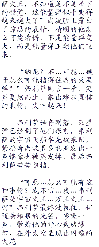 原本等待魔神星覆灭的弗利萨看着灭星弹落下,哈哈狂笑,但这狂笑没持续多久,愕然发现灭星弹还没有落在魔神星上,将行星炸毁!
