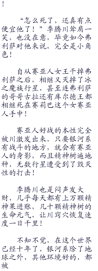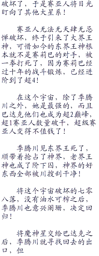 王宫内,王座上,季腾川望着天空,眯着眼睛,他刚刚没将弗利萨使用灭星弹的猜测告诉赛莉巴,就是为了磨练她,而且就目前情况来看,非常好!