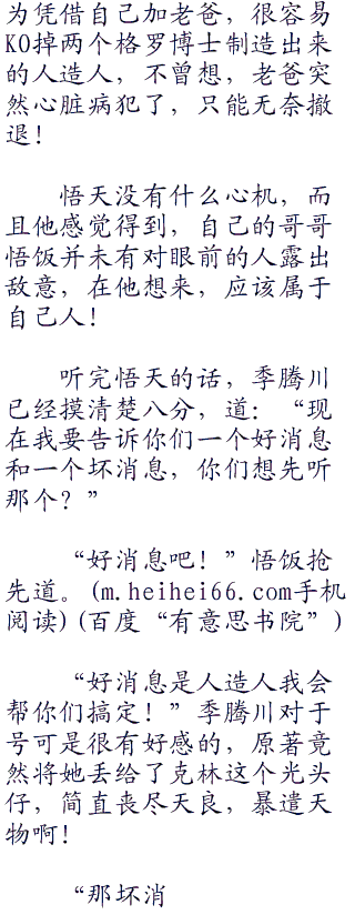 悟天露出了伤感的表情,强忍着泪道:“爸爸得了心脏病死了,贝吉塔叔叔也被可恶的人造人杀死了,最后哥哥爆发,以一敌二,不过人造人实在太多了,最后哥哥为了保护我们和他们”