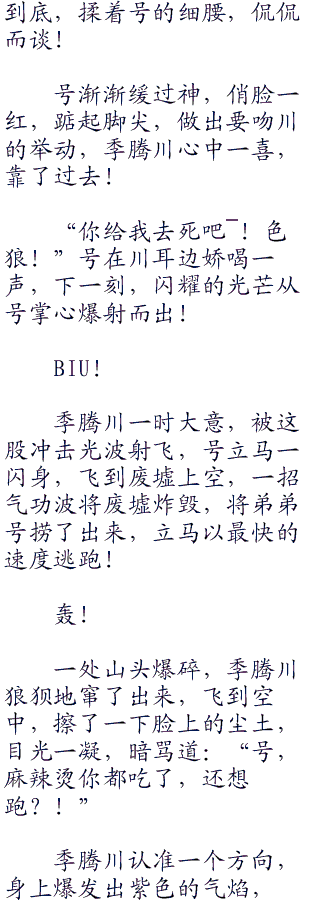 季腾川起手,格挡住号的横踢,顺手抓住了号的脚踝,轻轻一捏,很柔软,就像是女孩子的肌肤一样,摸着很舒服!